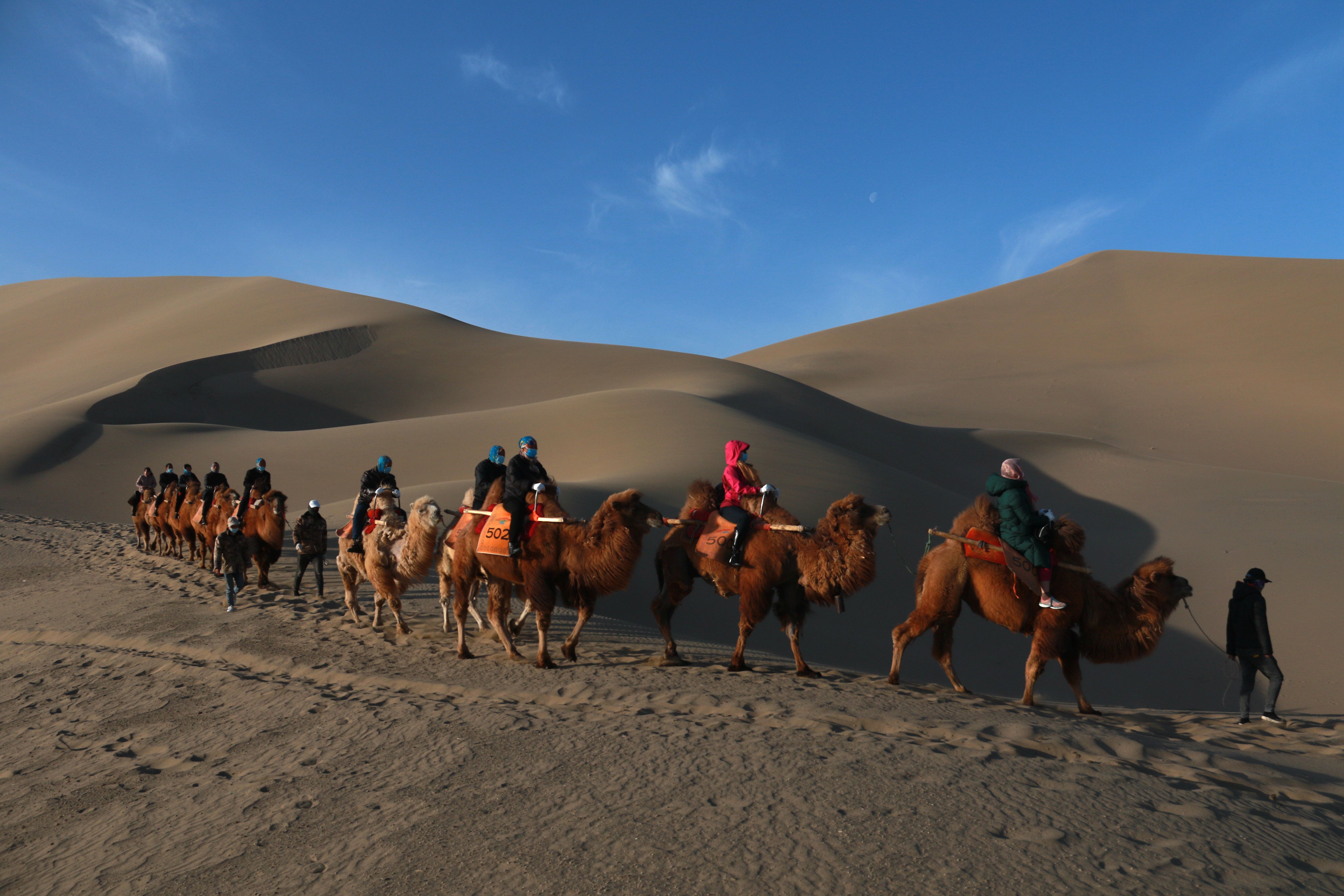 (新华社照片,2021年4月3日,游客在甘肃敦煌市鸣沙山月牙泉景区游览)