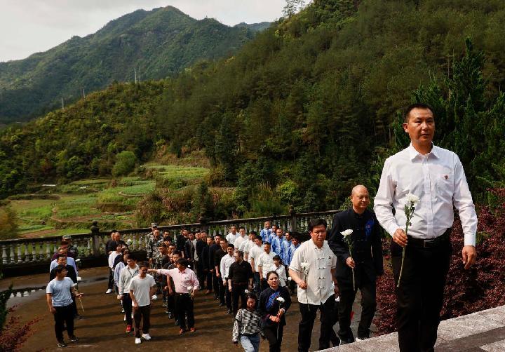 在觉村红军烈士纪念碑前,47名小学生整齐列队,依次上前献花,纪念牺牲的红军烈士。