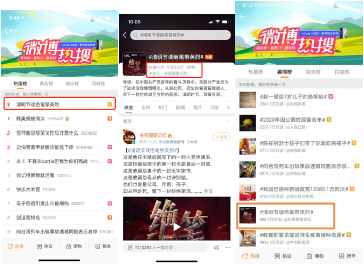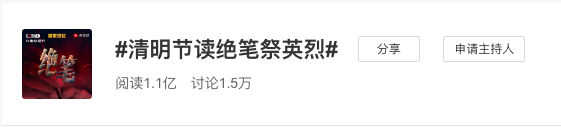 天地英雄气,千秋尚凛然。节目首集播出即引发了热烈反响,迅速成为社会关注焦点,触达人数高达947.6万。截至4月4日,微博话题#清明节读绝笔祭英烈#,阅读量达到1.1亿,讨论量超1.5万,登上微博热搜置顶位和微博要闻榜两大核心榜单,众多千万级、百万级微博大V纷纷评论转发;相关视频播放量合计突破300万,其中单条视频播放量达到160万。