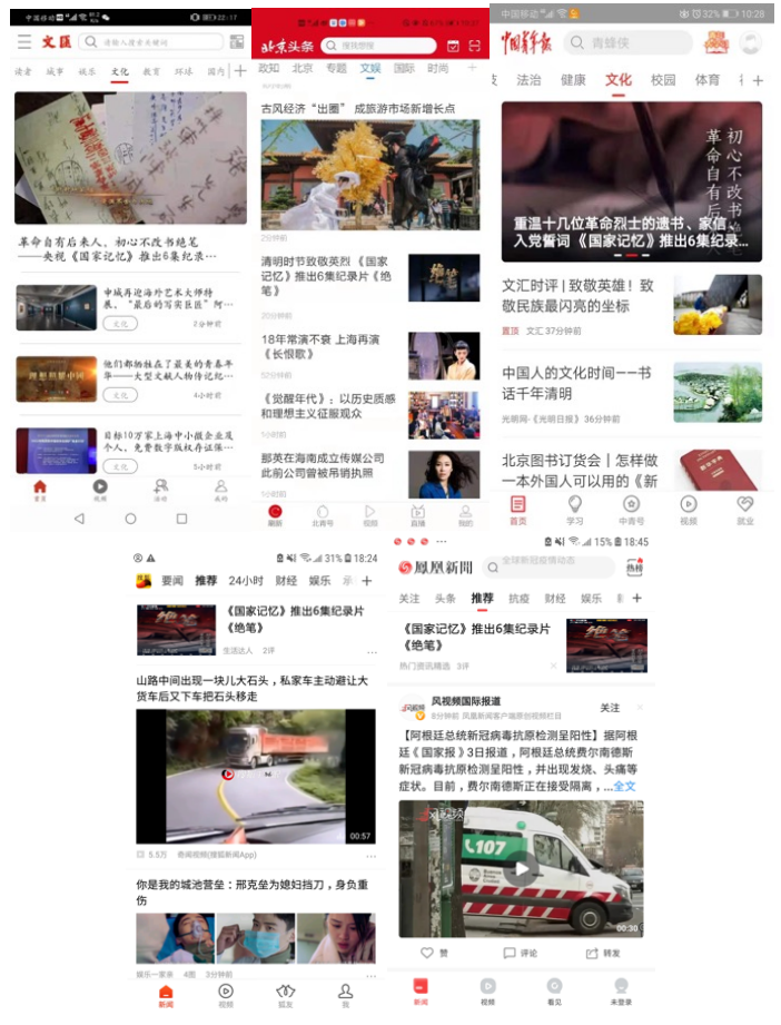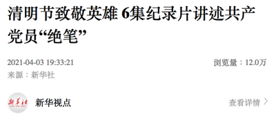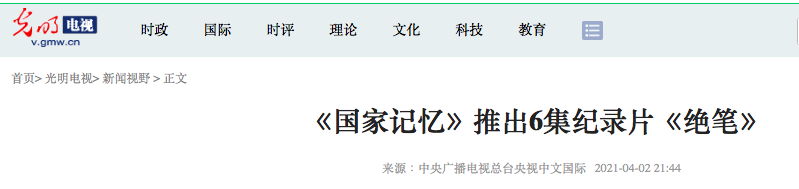 4月3日,中央广播电视总台华语环球节目中心《国家记忆》栏目特别推出六集纪录片《绝笔》,通过对十多位共产党员的遗书、家信、入党誓词等临终绝笔的深度挖掘,展现他们初心不改、信仰弥坚的革命精神。