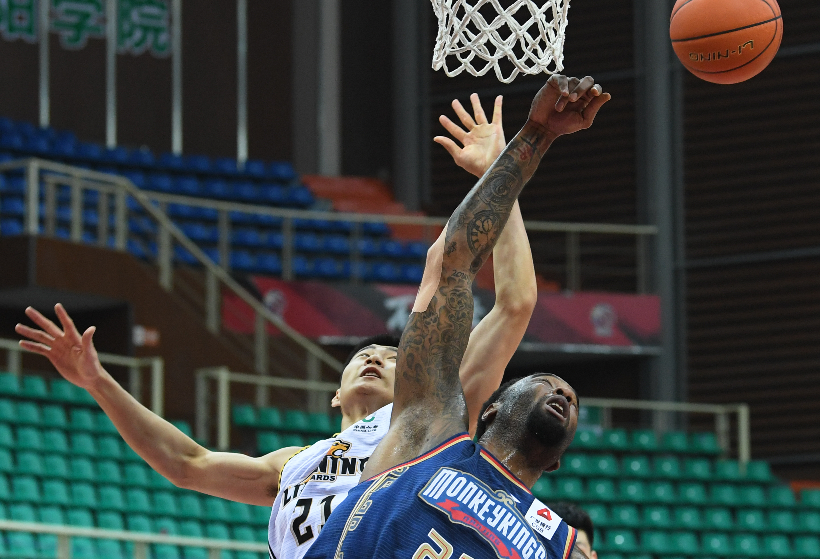 同曦队球员摩尔特里(右)和辽宁队球员吴昌泽拼抢篮板球。新华社记者翁忻旸摄