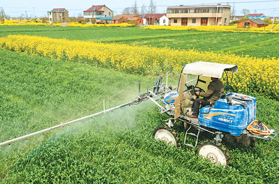 随着天气转暖,江苏省海安市隆政街道联合村俞万家庭农场的小麦长势良好,进入拔节抽穗的关键时期。当地村民抢抓农时,利用植保机对小麦进行防病害作业,为夏粮增产增收打下基础。图为联合村村民对小麦进行防病害作业。