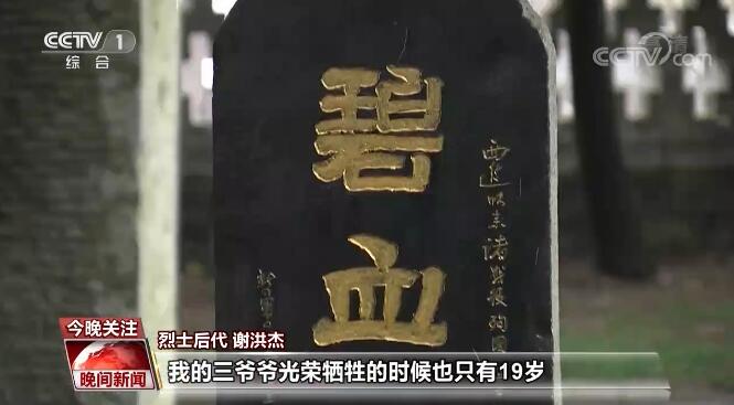 烈士后代 谢洪杰:这上面一个个姓名,一个个年轻的生命。我的爷爷兄弟三人于1940年抗日战争中光荣牺牲,我的三爷爷光荣牺牲的时候只有19岁,我二爷爷当年只有24岁,日军到跟前用刺刀扎了37刀。我想对烈士说,你们用鲜血和生命换来了今天的幸福,我们会继续继承你们的遗志奋发图强。