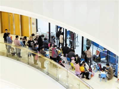 图为 家长们聚在在室内运动场门口,等待接孩子下课回家。