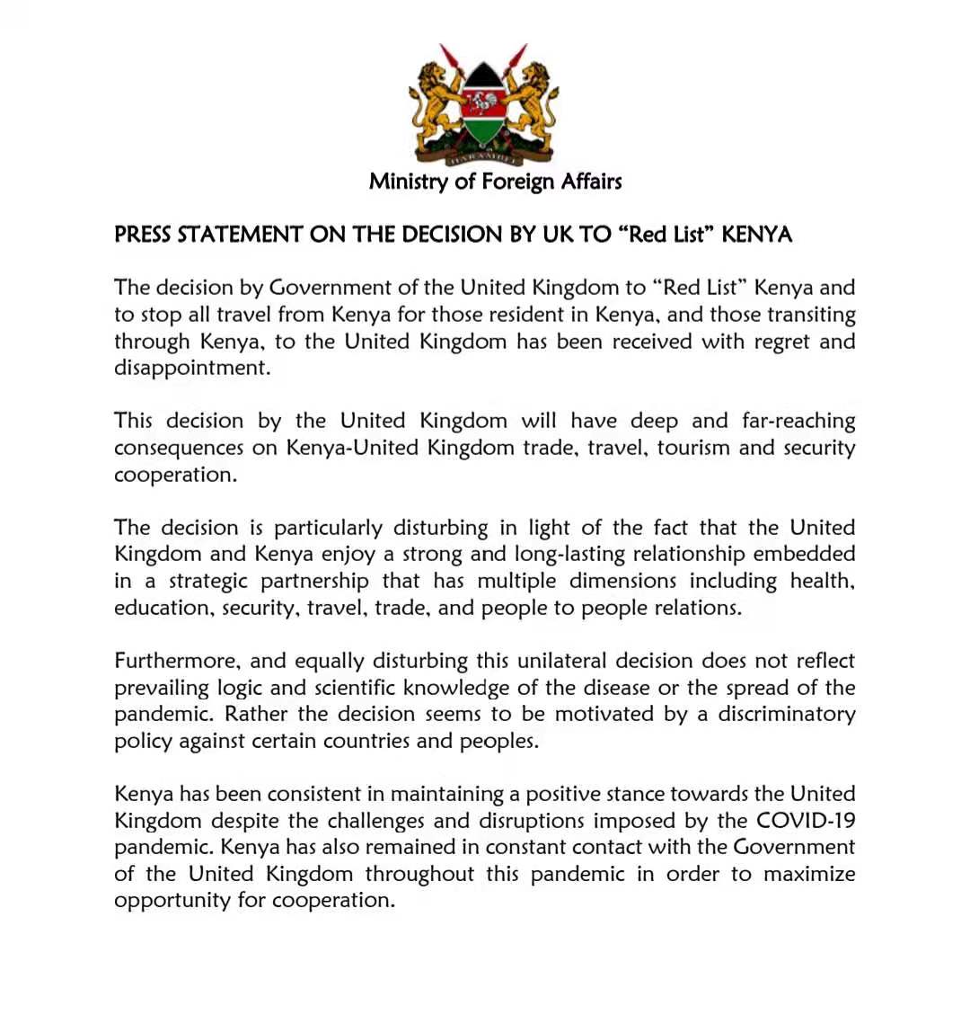 当地时间4月3日,针对英国将肯尼亚列入禁止入境旅行“红色名单”的决定,肯尼亚外交部发表声明说,英国这一决定具有“歧视性”、“惩罚性”,有损双边关系。英国的决定对双边贸易、旅游等多领域产生影响。