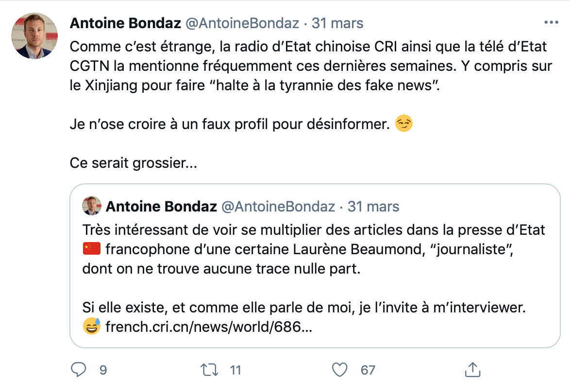 被中国驻法国大使卢沙野称为“小流氓”的所谓的中国问题专家安东尼·邦达兹,在社交媒体上迅速“盖楼”:“奇怪啊,中国官媒一再提及一名法国‘记者’,后者称新疆没有发生西方媒体说的事,然而我们在任何地方都没有找到这位‘记者’的存在痕迹。如果她存在的话,欢迎她来采访我…… 不敢想象,(他们)捏造一个假身份来混淆视听…… ”