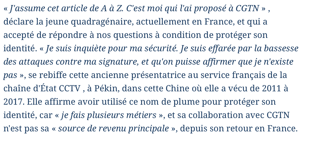 原来,这位因一篇挺疆撰文被法国《世界报》质疑“不存在“、为北京“捏造”的记者,是真实存在、来自萨尔特省的法国人。她透露说,罗汉娜·博蒙是她的笔名,之所以隐姓埋名,是因为不想因为说真话而“(在法国)有安全危险,被人群起攻之”。