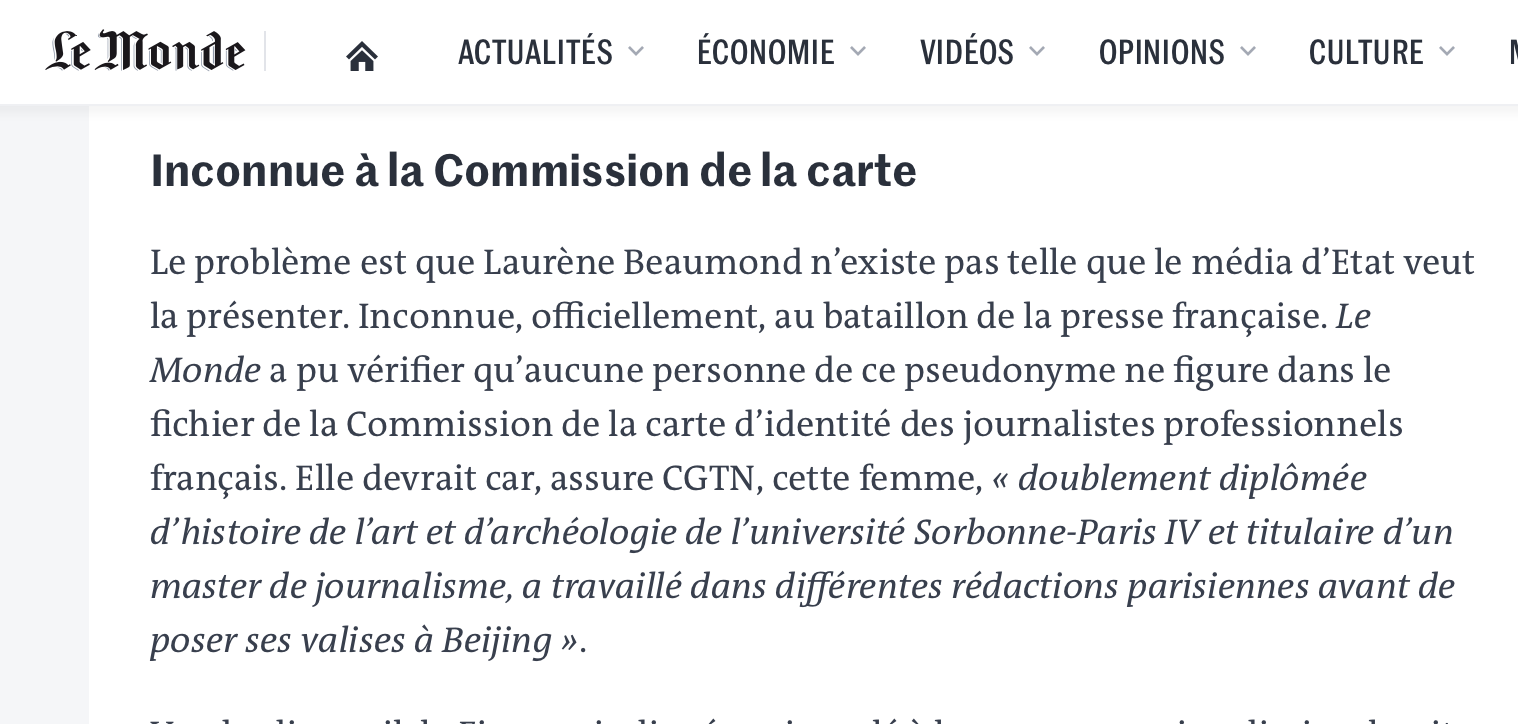 当地时间3月31日,法国《世界报》发文称,“查遍了法国职业记者证委员会的记者花名册,上面没有‘罗汉娜·博蒙’的名字”。于是便一口咬定,博蒙不存在,其身份系捏造。殊不知,法国有很多从事新闻工作的自由撰稿人没有记者证、亦不在记者证委员会登记?