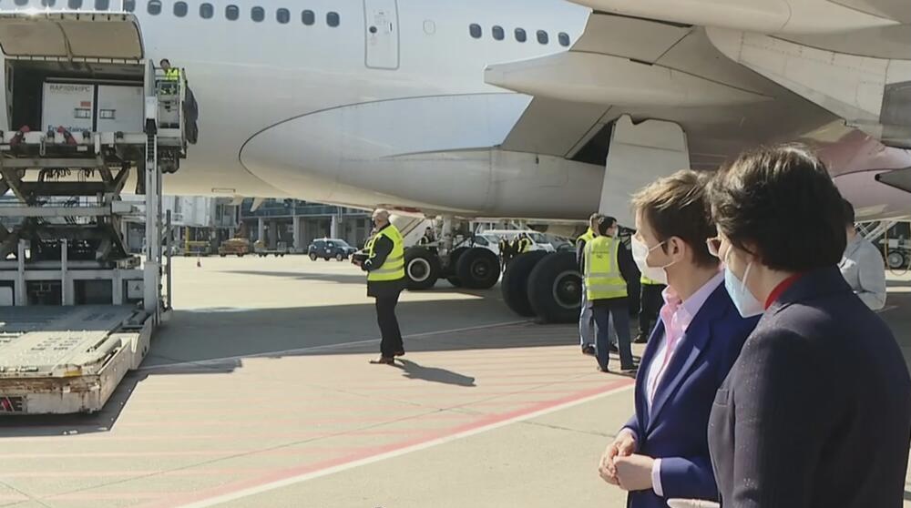 当地时间5日上午,第四批中国疫苗抵达塞尔维亚,塞尔维亚总理安娜·布尔纳比奇和中国驻塞尔维亚大使陈波到机场迎接。(总台记者 杨春)