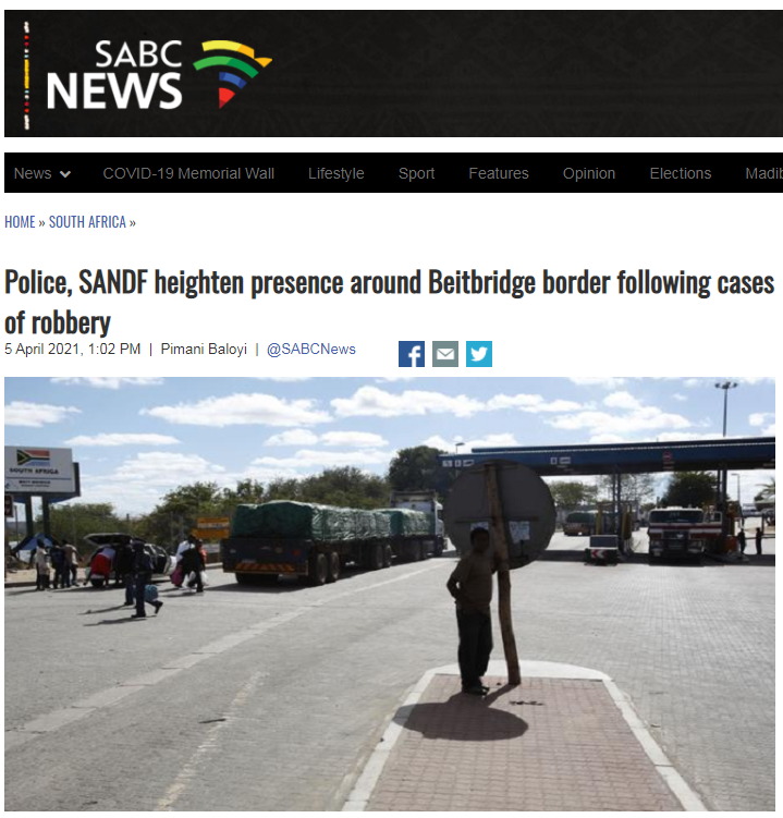 据南非国家广播公司当地时间4月5日报道,南非和津巴布韦边界贝特布里奇口岸附近抢劫频发,南军警宣布加强巡逻并向有组织犯罪方向进行调查。