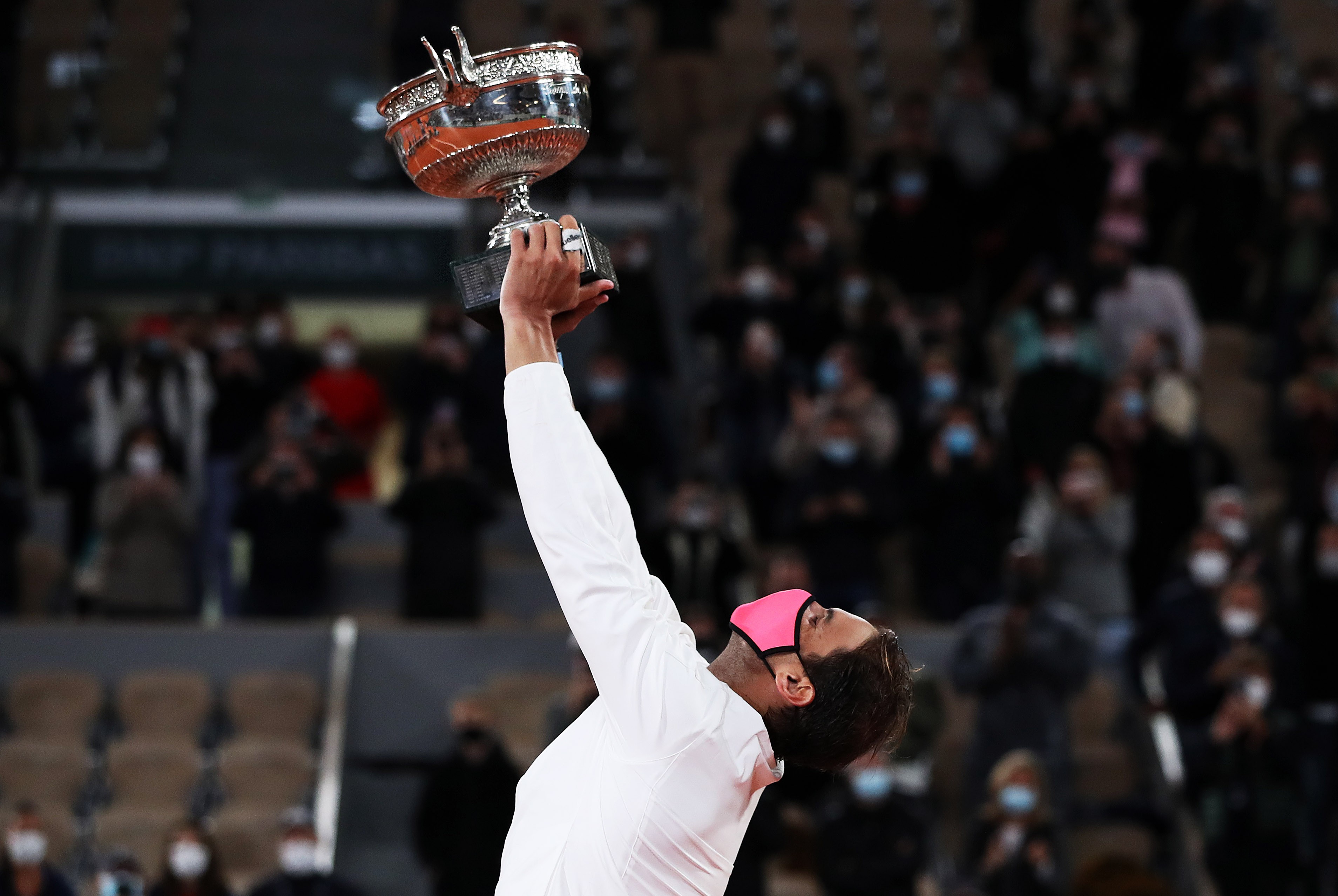 2020年10月11日,在2020法国网球公开赛男单决赛中,纳达尔第13次在罗兰加洛斯加冕男单冠军,并追平了瑞士人费德勒保持的20次大满贯夺冠的男子纪录。新华社记者高静摄