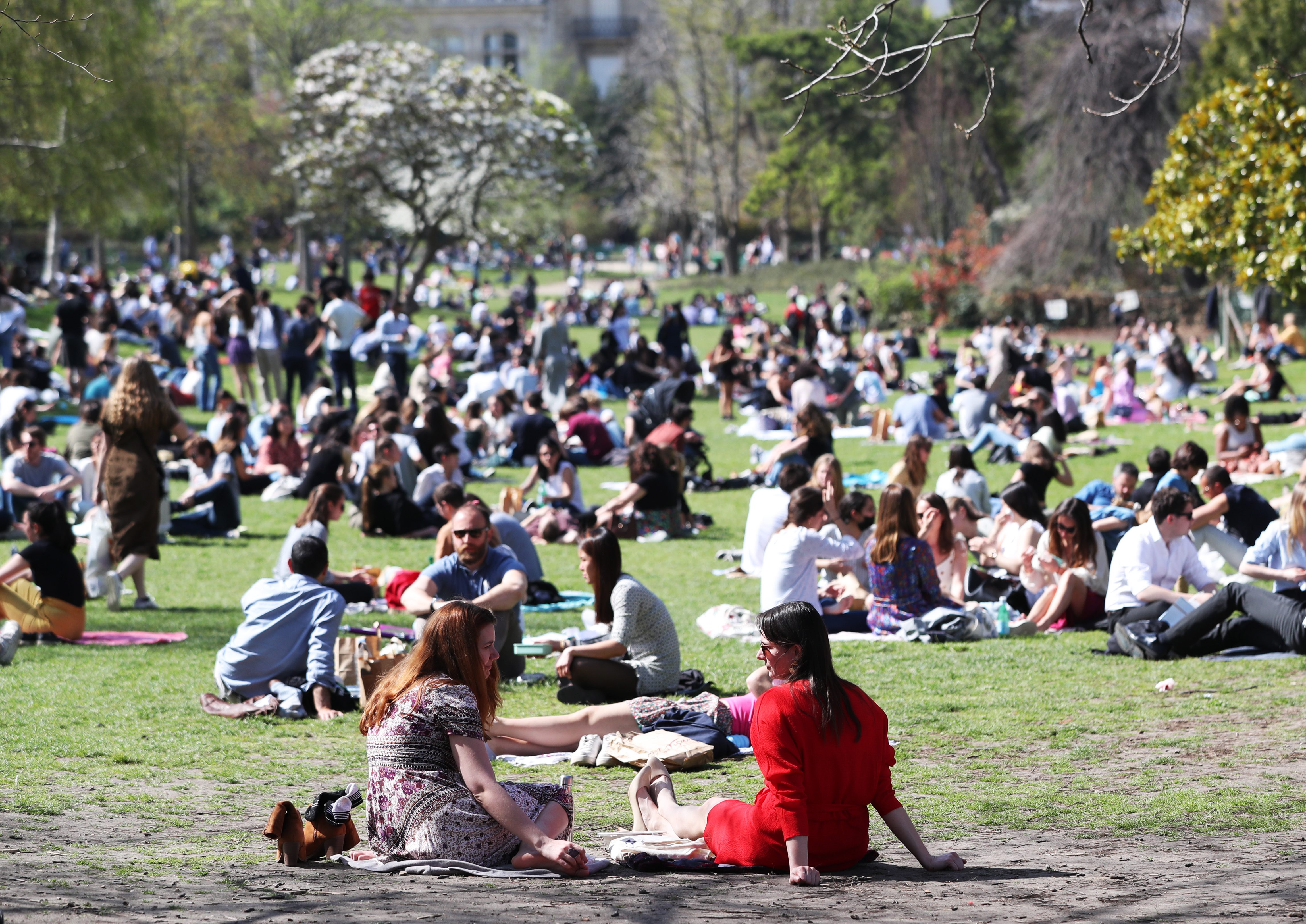 3月31日,人们在法国巴黎的蒙索公园野餐、晒太阳。新华社记者高静摄