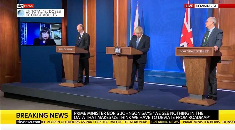 当地时间4月5日,在举行的新冠疫情例行发布会上,英国首相鲍里斯·约翰逊表示,政府不打算在英国放松封锁后的接下来两个阶段引入个人“新冠感染状况认证”,称这存在“复杂的、道德的和实际的问题”。(总台记者 白桦)