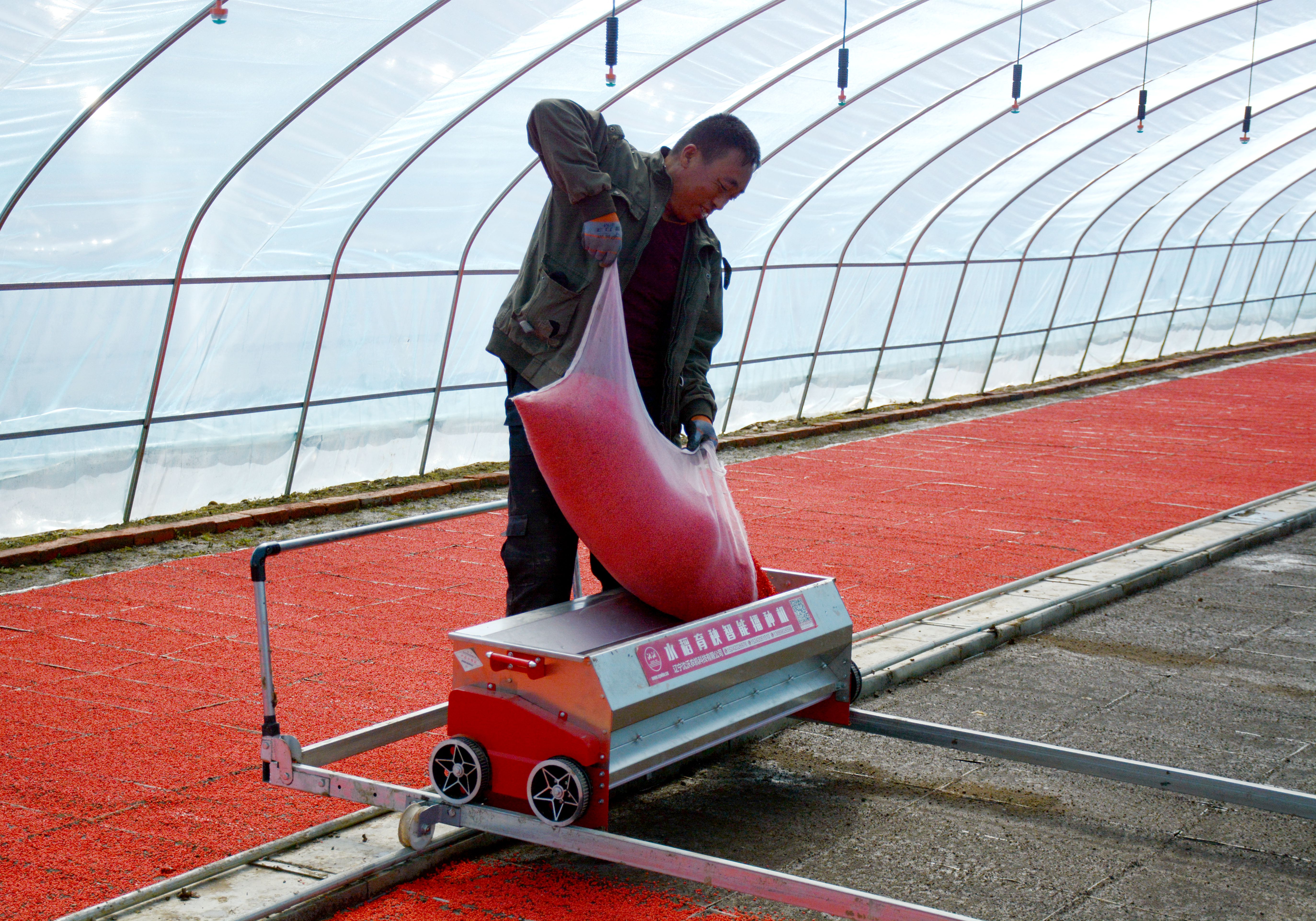 苏强拎起一袋红色包衣的水稻种子,倒进电动播种机,然后按下按钮,水稻电动播种机就来回运动了,身后的水稻种子就像铺好的红地毯,随后水稻电动覆土机在红色种子上覆盖一层黑土。