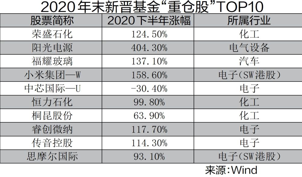 新晋“重仓股”方面,Wind统计显示,2020年末与年中相比,新进入基金主动配置前300的个股共78只。其中,排名前20的个股中,多数录得翻番行情。如阳光电源、长城汽车、石头科技、福耀玻璃、西部超导、荣盛石化,2020年下半年涨幅分别为404.3%、389.8%、176.1%、137.1%、133.2%、124.5%。