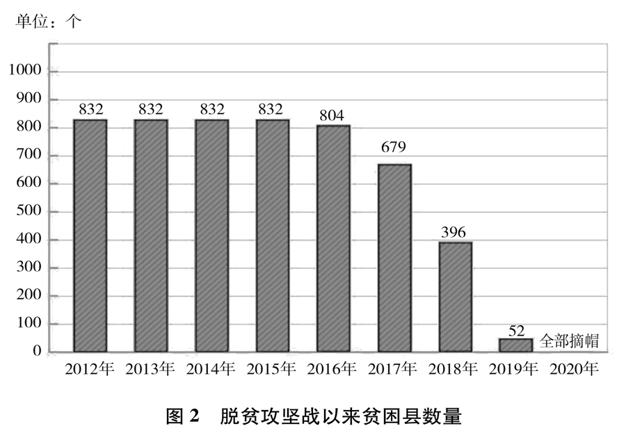 中共十八大以来,经过8年持续奋斗,到2020年底,中国如期完成新时代脱贫攻坚目标任务,现行标准下9899万农村贫困人口全部脱贫(图1),832个贫困县全部摘帽(图2),12.8万个贫困村全部出列,区域性整体贫困得到解决,完成消除绝对贫困的艰巨任务。