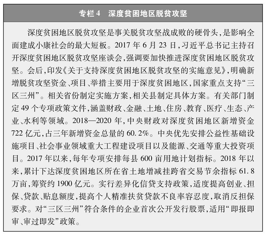深度贫困地区是贫中之贫、坚中之坚。通过脱贫攻坚,“三区三州”⑨等深度贫困地区突出问题得到根本解决,基础设施和公共服务水平显著提升,特色主导产业加快发展,社会文明程度明显提高,区域性整体贫困问题彻底解决(专栏4)。