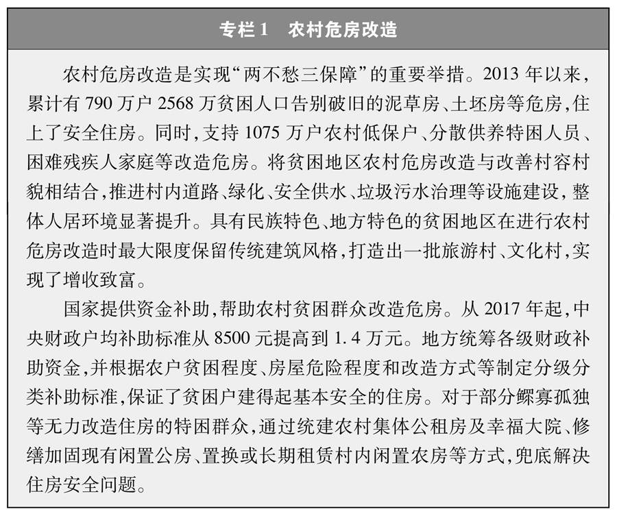 “两不愁三保障”全面实现。脱贫攻坚普查⑧显示,贫困户全面实现不愁吃、不愁穿,平时吃得饱且能适当吃好,一年四季都有应季的换洗衣物和御寒被褥。贫困人口受教育的机会显著增多、水平持续提高,农村贫困家庭子女义务教育阶段辍学问题实现动态清零,2020年贫困县九年义务教育巩固率达到94.8%。持续完善县乡村三级医疗卫生服务体系,把贫困人口全部纳入基本医疗保险、大病保险、医疗救助三重制度保障范围,实施大病集中救治、慢病签约管理、重病兜底保障等措施,99.9%以上的贫困人口参加基本医疗保险,全面实现贫困人口看病有地方、有医生、有医疗保险制度保障,看病难、看病贵问题有效解决。实施农村危房改造,贫困人口全面实现住房安全有保障(专栏1)。实施农村饮水安全和巩固提升工程,累计解决2889万贫困人口的饮水安全问题,饮用水量和水质全部达标,3.82亿农村人口受益;贫困地区自来水普及率从2015年的70%提高到2020年的83%。