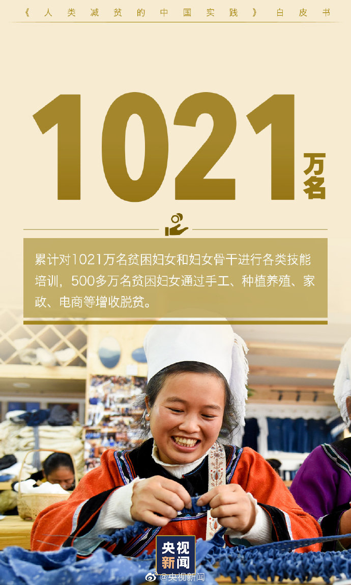 贫困妇女生存发展状况显著改善。坚持男女平等基本国策,将妇女作为重点扶贫对象,实现脱贫的近1亿贫困人口中妇女约占一半。累计对1021万名贫困妇女和妇女骨干进行各类技能培训,500多万名贫困妇女通过手工、种植养殖等增收脱贫。累计发放妇女小额担保贷款和扶贫小额信贷4500多亿元,帮助870万名妇女实现创业增收。