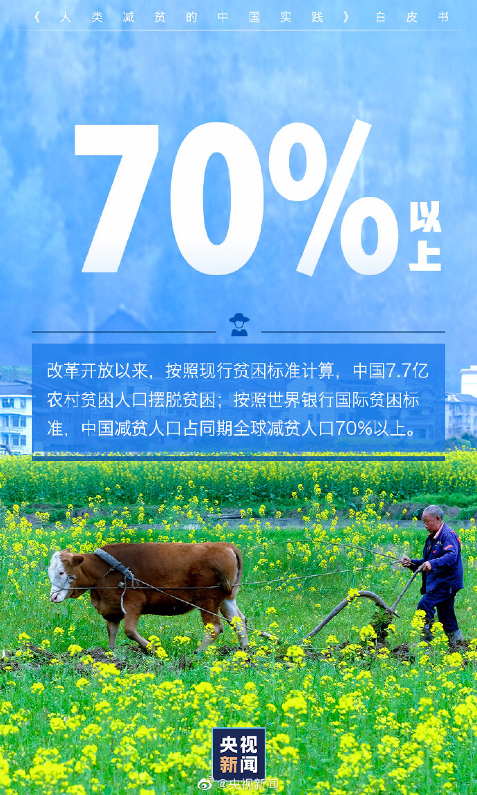 改革开放以来,按照现行贫困标准计算,中国7.7亿农村贫困人口摆脱贫困;按照世界银行国际贫困标准,中国减贫人口占同期全球减贫人口70%以上。