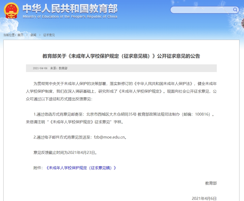 4月6日,教育部公布《未成年人学校保护规定(征求意见稿)》,面向社会公开征求意见。征求意见稿提出:学校不得组织、安排学生从事抢险救灾或者商业性活动,不得安排学生参与有毒、有害的危险性工作以及其他不宜学生参加的活动;学校不得公开学生个人的考试成绩、名次;在奖励、资助、申请贫困救助等工作中,不得泄露学生个人及其家庭隐私;义务教育学校不得以长期停课、劝退等方式,剥夺学生受教育权,不得开除或者变相开除学生;学校不得要求学生在规定的上课时间前提前到校参加统一的课程教学活动。