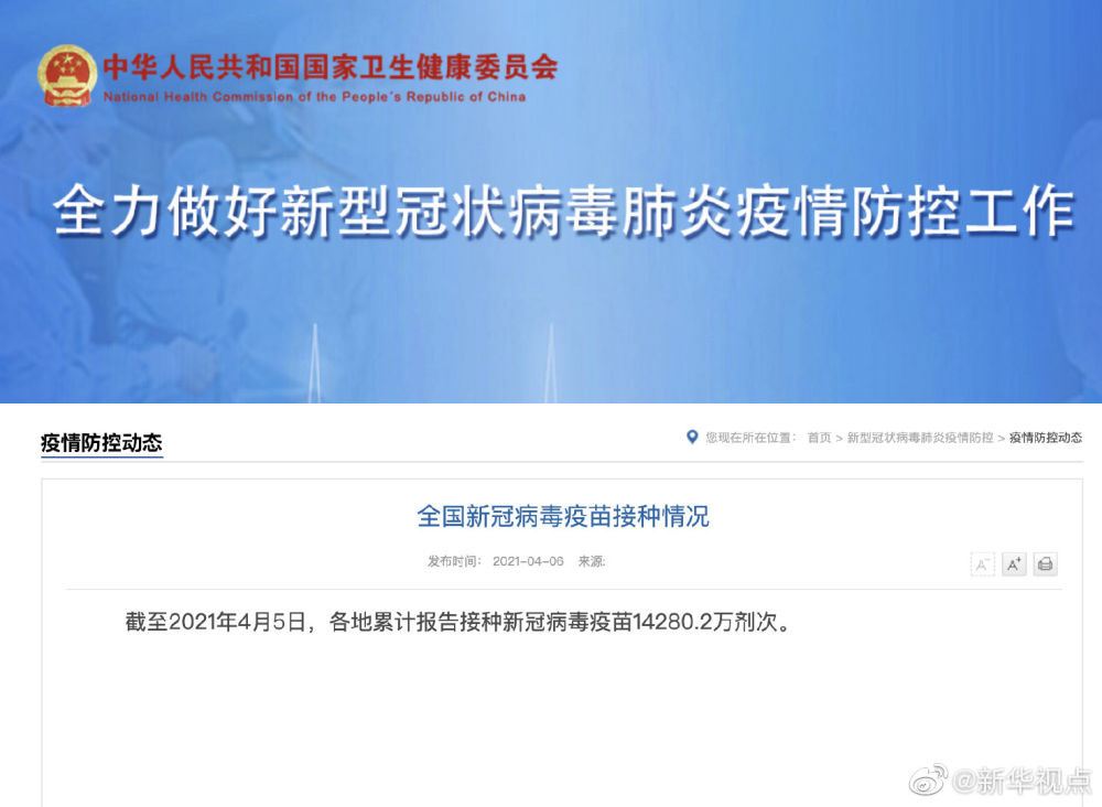 国家卫健委6日发布,截至2021年4月5日,各地累计报告接种新冠病毒疫苗14280.2万剂次。