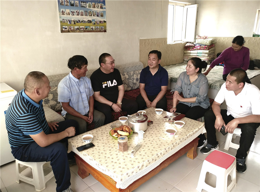 羊羊牧业董事长周勇(左三)在苏尼特右旗贫困牧民家慰问(2018年7月6日摄)。羊羊牧业供图