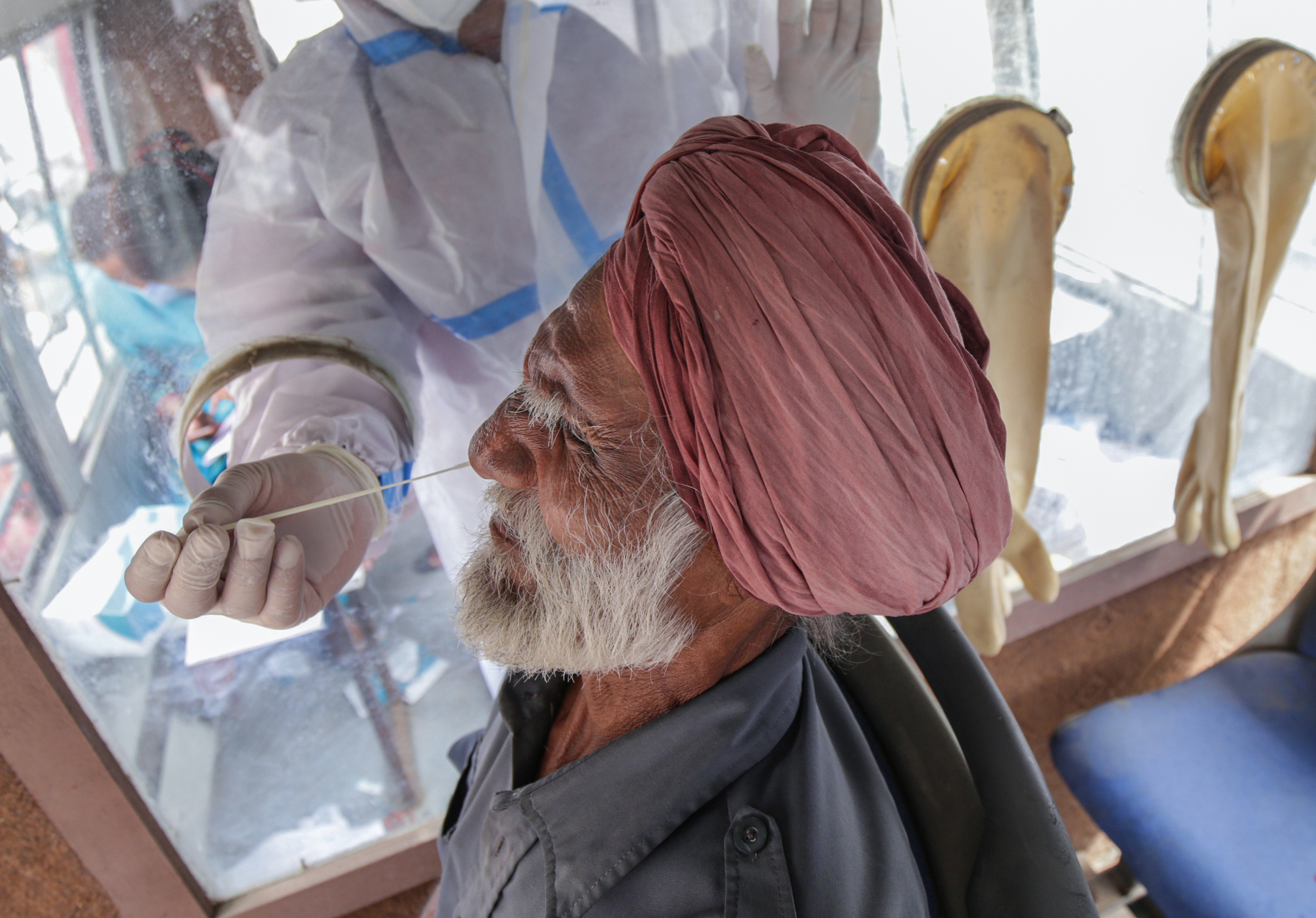 3月25日,一名男子在印度阿姆利则接受新冠病毒检测取样。新华社发