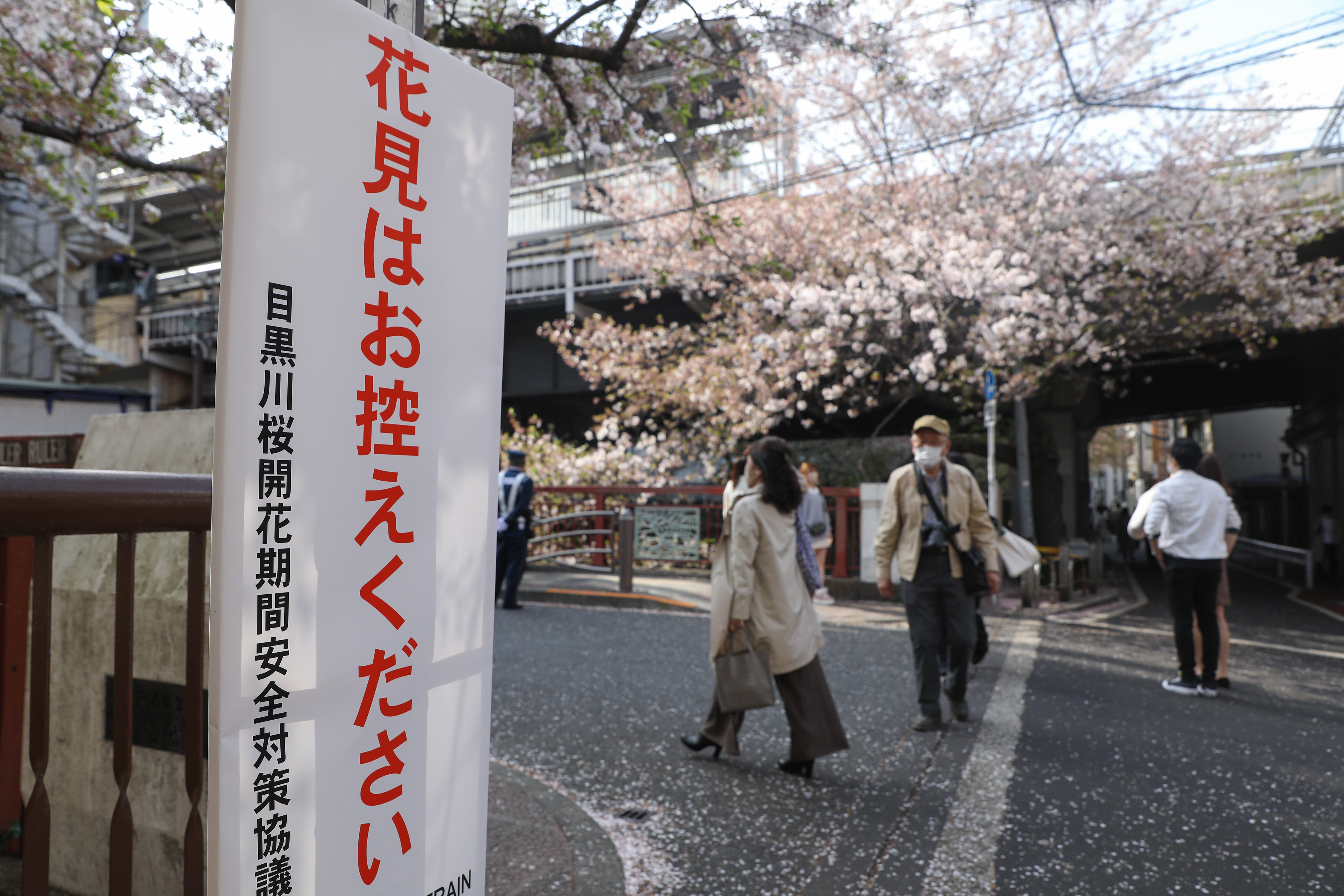这是4月1日在日本东京目黑川附近的赏樱景点拍摄的防疫告示板。新华社记者杜潇逸摄