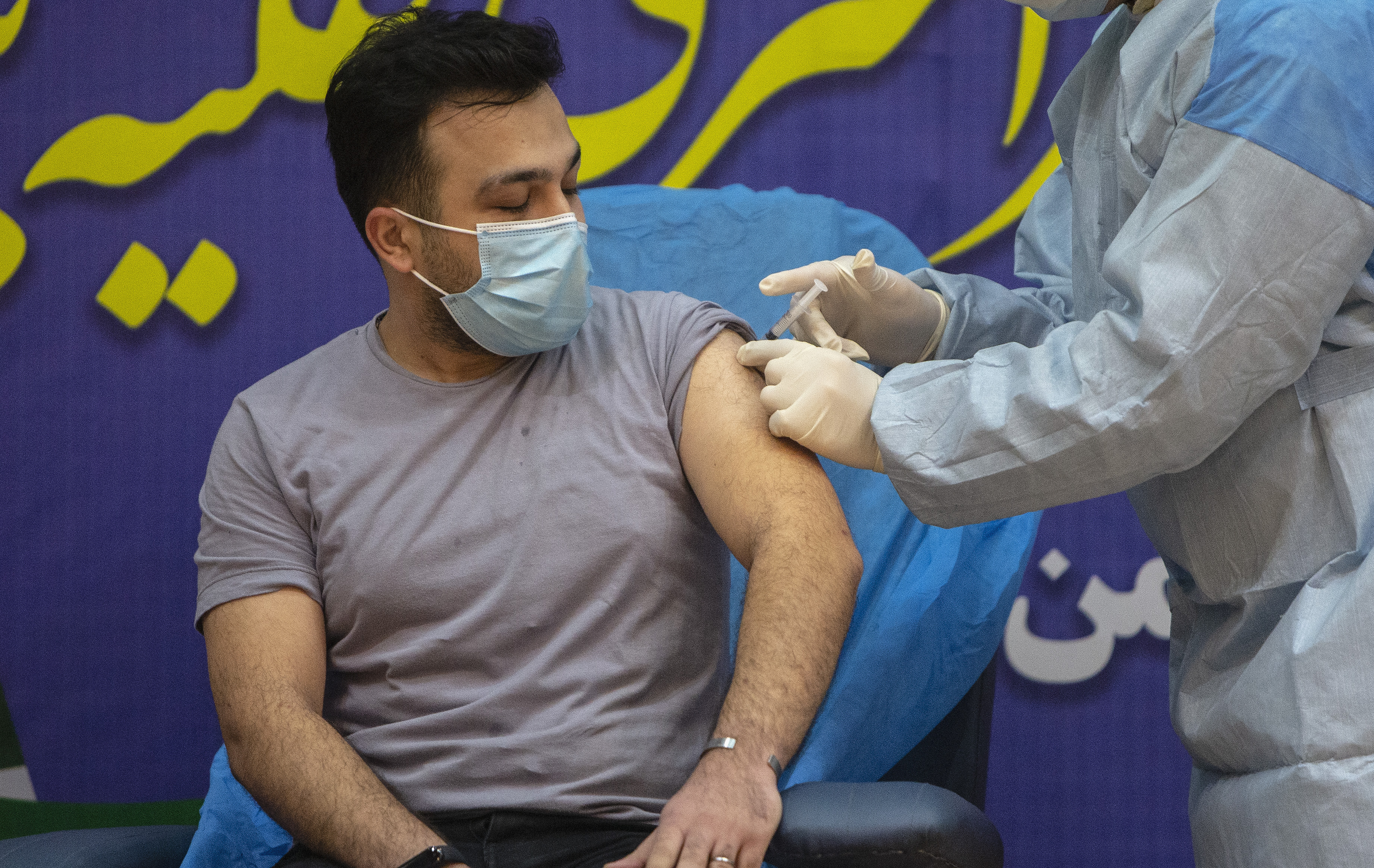 2月9日,在伊朗德黑兰,医务人员为接种者注射新冠疫苗。新华社发