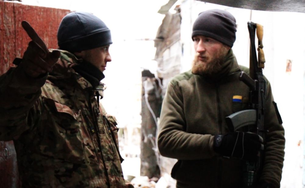 2016年12月24日,在乌克兰顿涅茨克州马林卡镇,两名乌克兰军人在前线哨所内交谈。新华社记者陈俊锋摄
