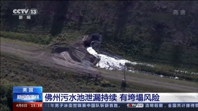 美国佛罗里达州坦帕湾一座工业污水池连日泄漏,并有垮塌风险。5日,当地作业人员加大了抽水力度。当地居民担心附近环境和饮用水会受到污染。