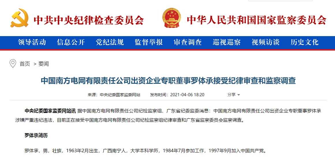 据中国南方电网有限责任公司纪检监察组、广东省纪委监委消息:中国南方电网有限责任公司出资企业专职董事罗体承涉嫌严重违纪违法,目前正在接受中国南方电网有限责任公司纪检监察组纪律审查和广东省监察委员会监察调查。
