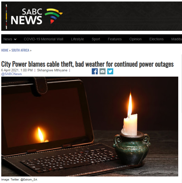 据南非国家广播公司当地时间4月6日报道,在近期南非各界纷纷批评该国国家电力公司腐败、管理不善导致各地经常拉闸限电后,南非国家电力公司近期回复称,电缆盗窃和暴风雨是该国经常断电的主要原因。上周的一场暴风雨后,一棵大树曾倒在输电线路上,并造成南非最大城市约翰内斯堡的大面积停电。(总台记者 周涛)
