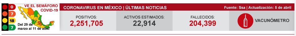 当地时间4月5号,墨西哥卫生部宣布,截至4月5日19时,墨西哥全国新冠肺炎累计确诊2251705例,较前一天新增1247例。墨西哥全国确诊死亡病例较前一天新增252例,总数已经上升到204399例。(总台记者 盛嘉迪 吕兴林)