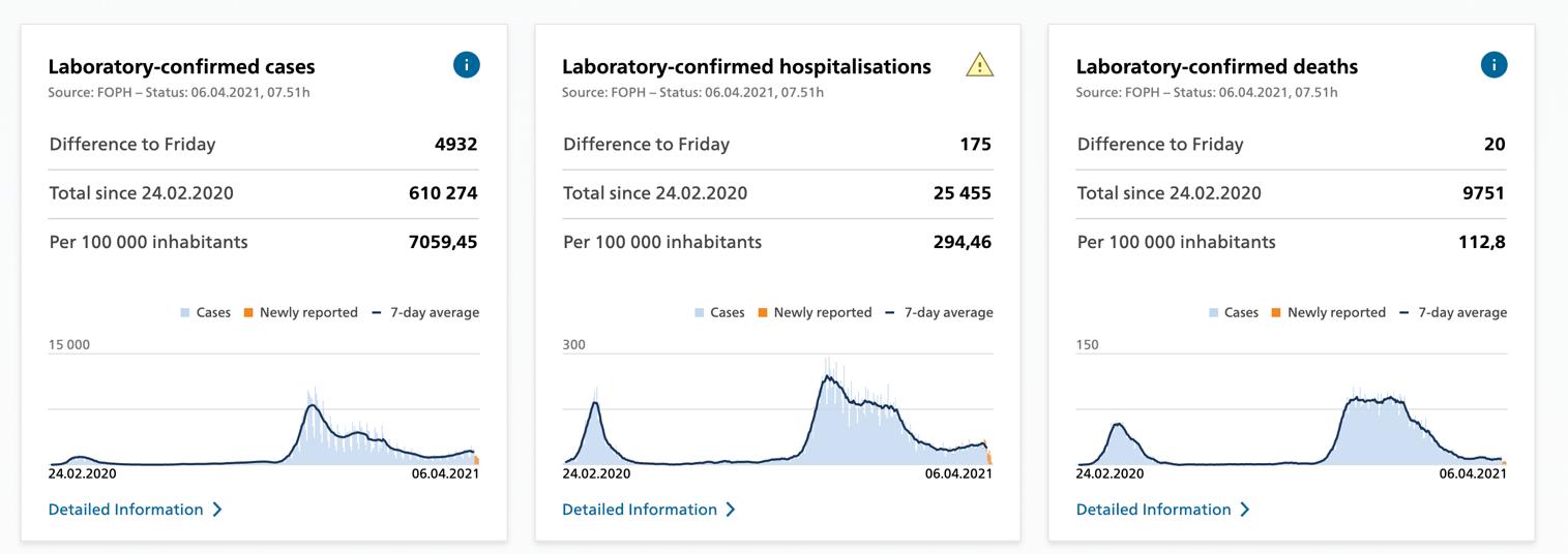 根据瑞士联邦公共卫生部6日公布的疫情数据,瑞士及列支敦士登公国累计确诊新冠肺炎病例610274例,较上周五新增4932例,住院治疗病例较上周五新增175例。累计死亡9751例,较上周五新增20例。