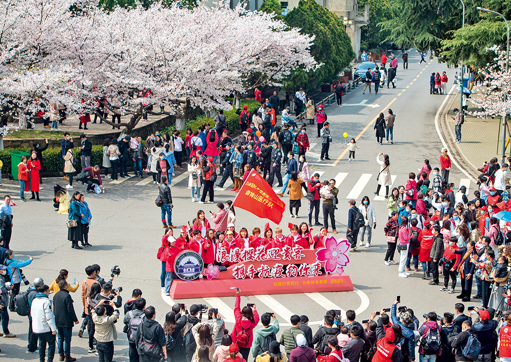 3月13日,来自全国各地的援鄂抗疫英雄在武汉大学樱花树下重逢,尽享樱花之约 肖艺九摄/本刊