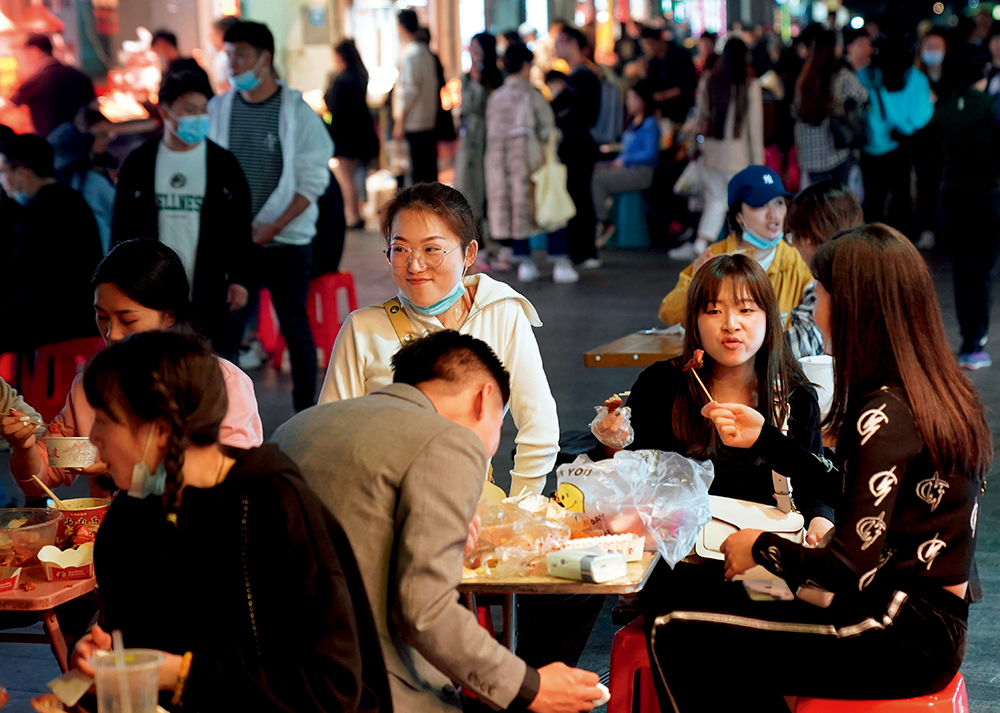 年轻人在武汉著名的户部巷品尝小吃(3月28日摄) 程敏摄/本刊