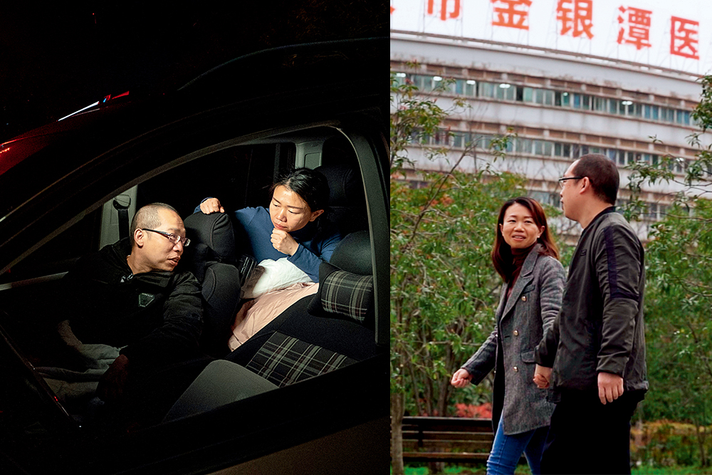 “武汉市金银潭医院”的霓虹灯光照进车里,映在涂盛锦和曹珊脸上,涂盛锦在前排副驾斜躺着,翻着书,曹珊在后排半卧着,盯着手机,时不时两人就把头凑一块聊上几句。