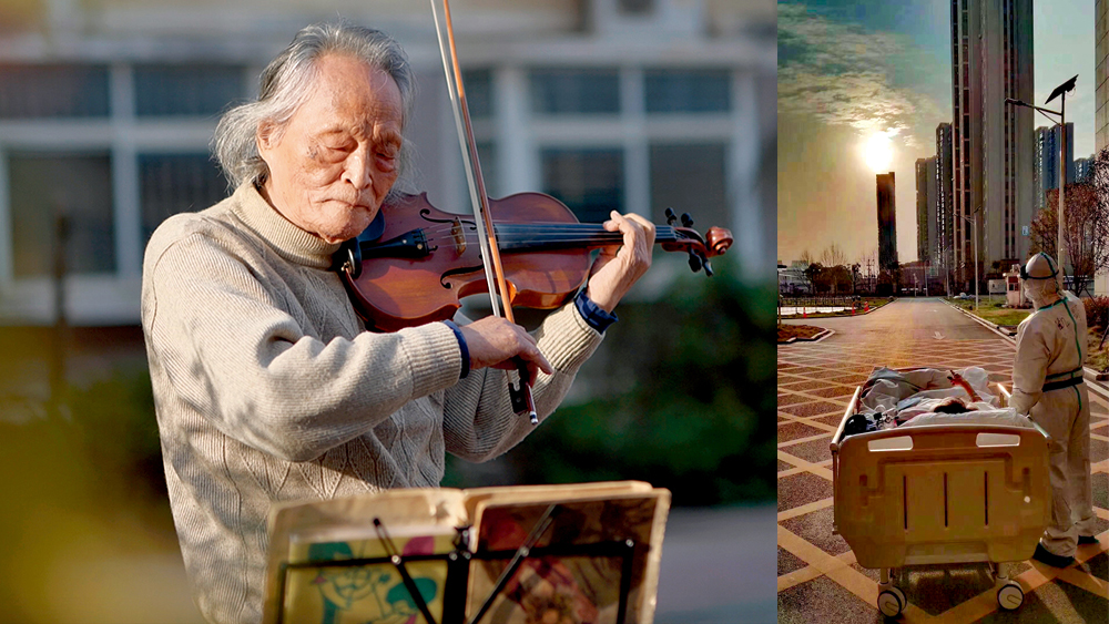 2020年3月5日傍晚,在武汉大学人民医院东院,复旦大学附属中山医院湖北医疗队的刘凯在护送87岁的患者王欣做CT的途中停下,让住院近 1 个月的王欣欣赏久违的落日。一年之后,89 岁的王欣重搭弓再抚弦 左图:熊琦摄/本刊 右图:甘俊超摄/本刊