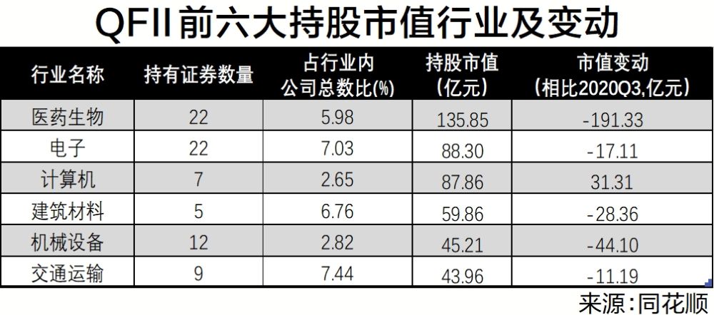 从行业整体持仓而言,同花顺数据显示,在28个申万一级行业中,QFII持仓市值最高的五大行业分别为医药生物、电子、计算机、建筑材料和机械设备,持有证券数量分别为22只、22只、7只、5只和12只。其中,医药生物持仓市值最高,达135.85亿元,电子、计算机行业持股市值也在80亿元以上。QFII持股市值增幅最大的为计算机行业,相比去年三季度增长超30亿元。新进方面,除电子行业外,化工、有色等顺周期行业也较获外资青睐,新进上市公司数量较多。