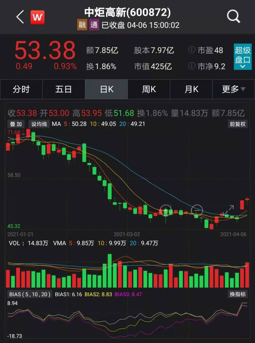 去年9月3日,中炬高新股价达到83.38元/股的历史新高,之后出现调整,截至4月6日收盘,中炬高新收报53.38元/股。从去年9月3日至今,股价跌幅达35.57%。