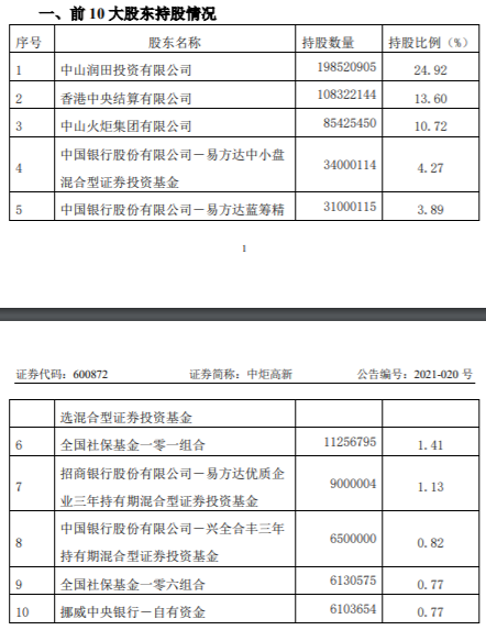 公告还披露了董事会公告回购股份决议的前一个交易日(4月1日)登记在册的前10大股东,中炬高新前十大股东中,有多达7家机构投资者在列。其中,张坤管理的易方达中小盘、易方达蓝筹精选、易方达优质企业三年持有分别为中炬高新的第四、第五、第七大股东。