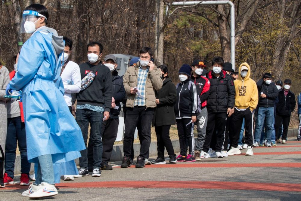 3月14日,人们在韩国京畿道华城市一新冠检测点等待检测。(新华社发,徐儒锡摄)