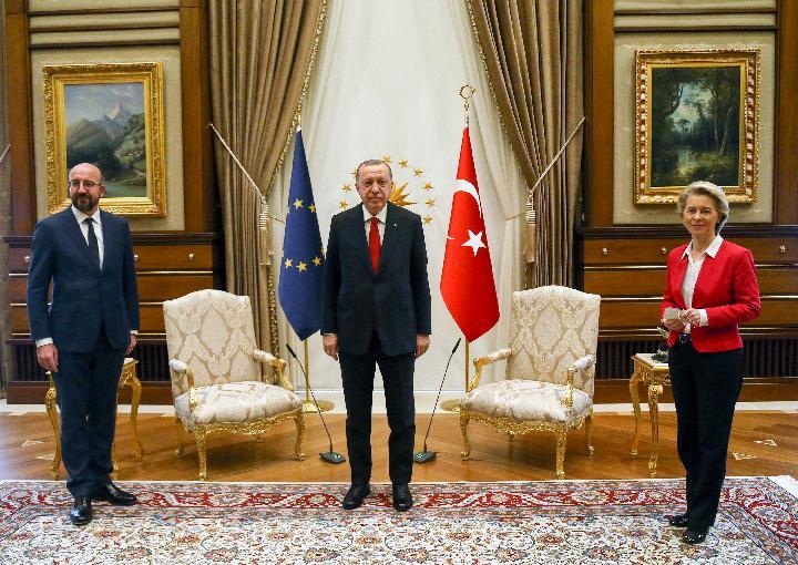 4月6日,土耳其总统埃尔多安(中)在安卡拉会见到访的欧洲理事会主席米歇尔(左)和欧盟委员会主席冯德莱恩。(新华社发,穆斯塔法·卡亚摄)