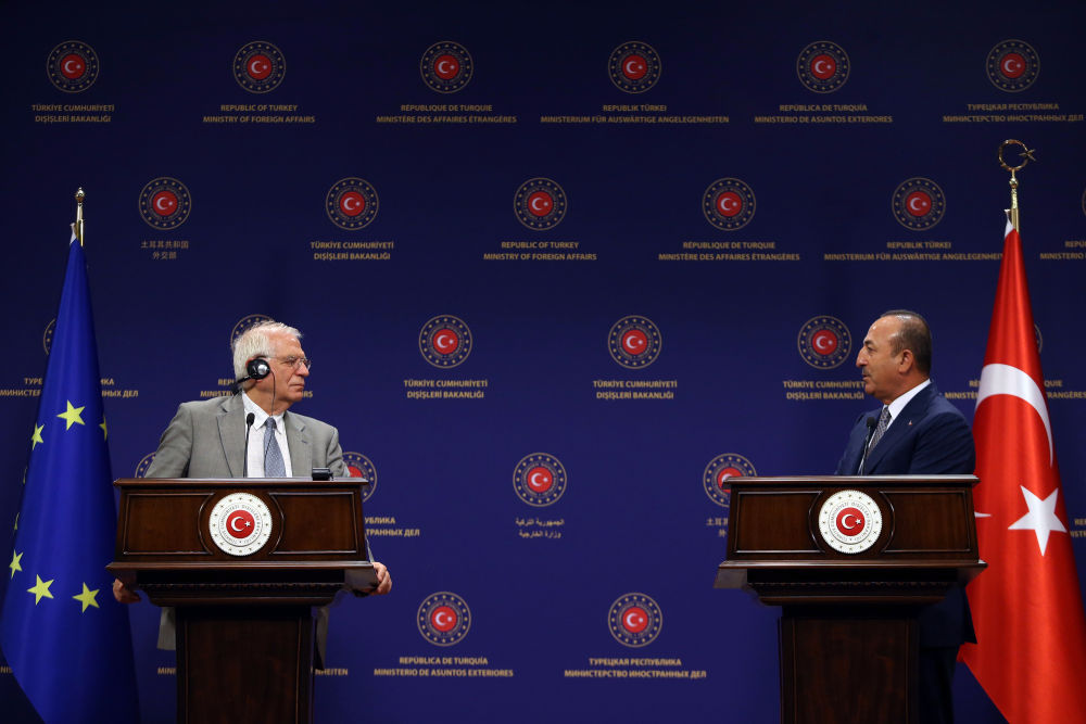 2020年7月6日,在土耳其安卡拉,土耳其外长恰武什奥卢(右)与欧盟外交与安全政策高级代表博雷利出席联合记者会。恰武什奥卢称,如果欧盟因东地中海地区分歧而决定对土耳其实施新制裁,土耳其将采取反制措施。(新华社发)