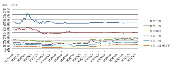 具体来看,精品二级咖啡豆均价报53.57元/公斤,较上期下跌0.07元/公斤,跌幅0.13%;精品三级咖啡豆均价报35.93元/公斤,较上期下跌0.04元/公斤,跌幅0.11%;优质咖啡豆均价报24.34元/公斤,较上期下跌0.47元/公斤,跌幅1.89%;商业一级咖啡豆均价报23.20元/公斤,较上期下跌0.60元/公斤,跌幅2.52%;商业二级咖啡豆均价报17.75元/公斤,较上期下跌0.05元/公斤,跌幅0.28%;商业三级及以下咖啡豆均价报12.42元/公斤,较上期持平。