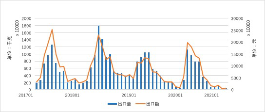图3:2017年至2021年2月我国未焙炒未浸除咖啡碱的咖啡出口情况(数据来源:海关总署)