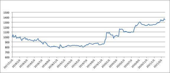 4月2日,指数报1347.71点,较上期(2021.3.22-3.28下同)下跌22.59点,跌幅1.65%,与基期相比上涨347.71点,涨幅34.77%。
