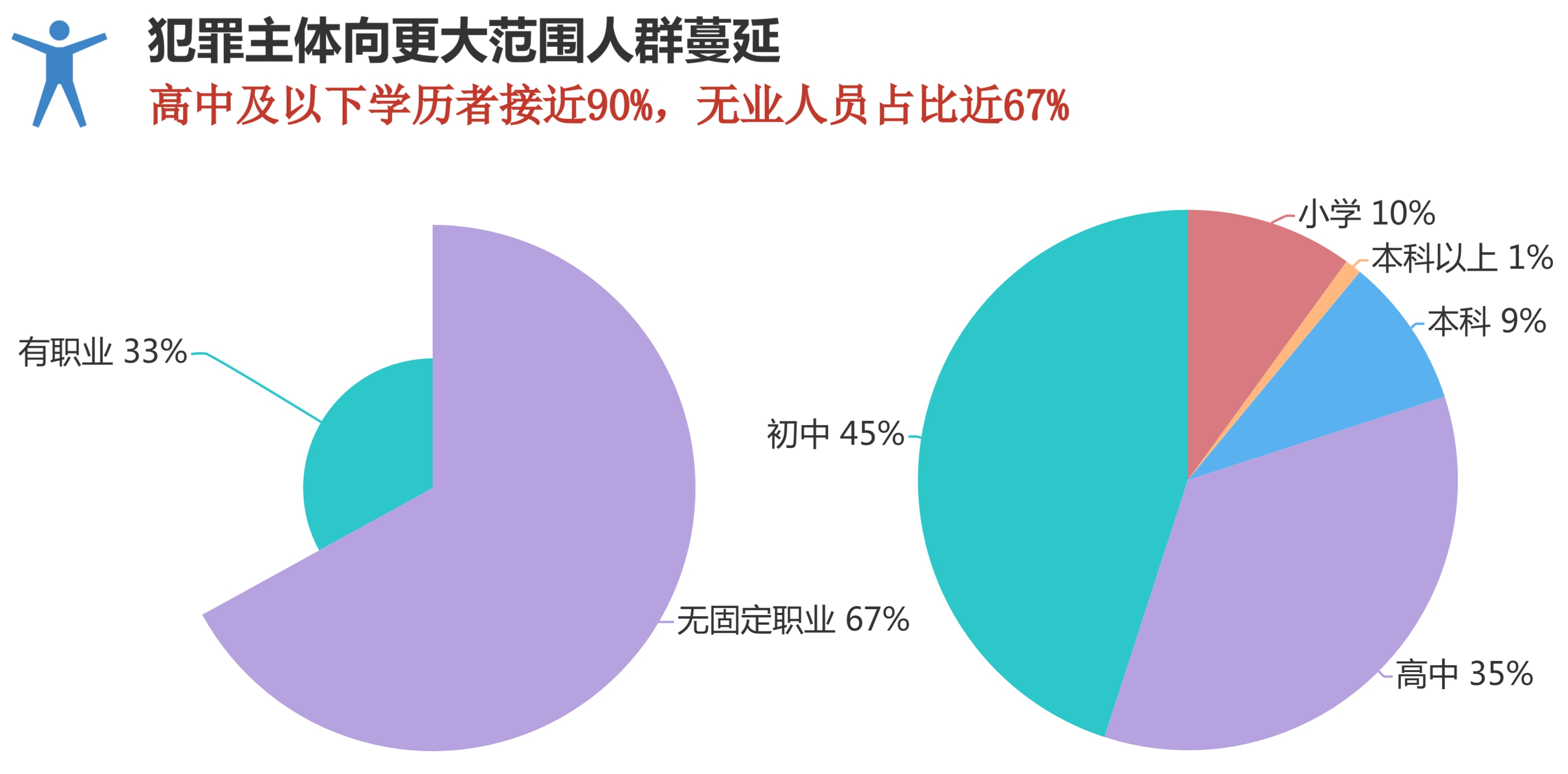 ——犯罪主体呈现“三低”特征。2020年检察机关起诉的网络犯罪案件中,未成年犯罪嫌疑人同比增长35.1%,在校学生同比增长80%,犯罪主体呈现低年龄、低学历、低收入趋势。